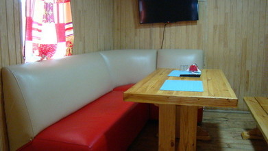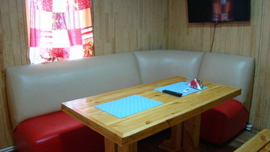 Комплекс «Деревенская баня на дровах» предлагает посетителям на выбор ресторанные блюда, доставку которых сотрудники организуют самостоятельно. Также вы можете привезти с собой на отдых домашнюю еду – в каждом домике есть кухонная зона и холодильник. А горячительные напитки и легкие закуски вы сможете приобрести в собственном баре комплекса.